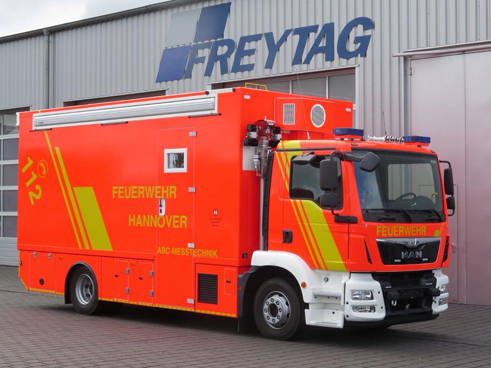 Gerätewagen Messtechnik für die Feuerwehr Hannover Kunde: Feuerwehr Hannover Fahrzeugtyp: GW Mess Fahrzeugbasis: MAN TGM 12.290 4 x 2 LL C Fahrerhaus Beschreibung: Gerätewagen Messtechnik für die Feuerwehr Hannover Technische Daten: zulässiges Gesamtgewicht: 15.000 kg Fahrzeugabmessungen (L / B / H): 8.300 / 2.550 / 3.400 Besonderheiten: Allison Wandler Getriebe